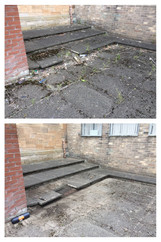 But this is more than just about attending a church service on a Sunday. Being "Church in the Community" means exactly that - getting involved in the life of the community through the whole week and not just for the hour or so on a Sunday. So, over the last few weeks, various activities have been taking place at the Centre whereby many of our church people have been able to not just be Church in the Community, but also to enact the second part of the mission statement - Serving the Community. This is from as simple an act as attending and supporting the community café in the centre which many of the families did during the school holidays, to building shelving in a few of the storage cupboards - some for the church benefit but others for the benefit of the various community activities. One other activity has been led by our girls who looked at the outside areas and wanted to tidy them up. This involved litter picking, weeding, sweeping and other similar tasks. So, over 3 Saturdays so far, the girls, assisted by us and a few other families, have been busy cleaning up these outside areas, much to the delight of the volunteers who look after the centre and to the general confusion of local passers-by who are obviously wondering why people would give any care to this place. But that is exactly why we were doing this. Because we do care and the people in Camelon deserve to know that people care for them. (See the images below for Before and After views - you can click each image to enlarge it).